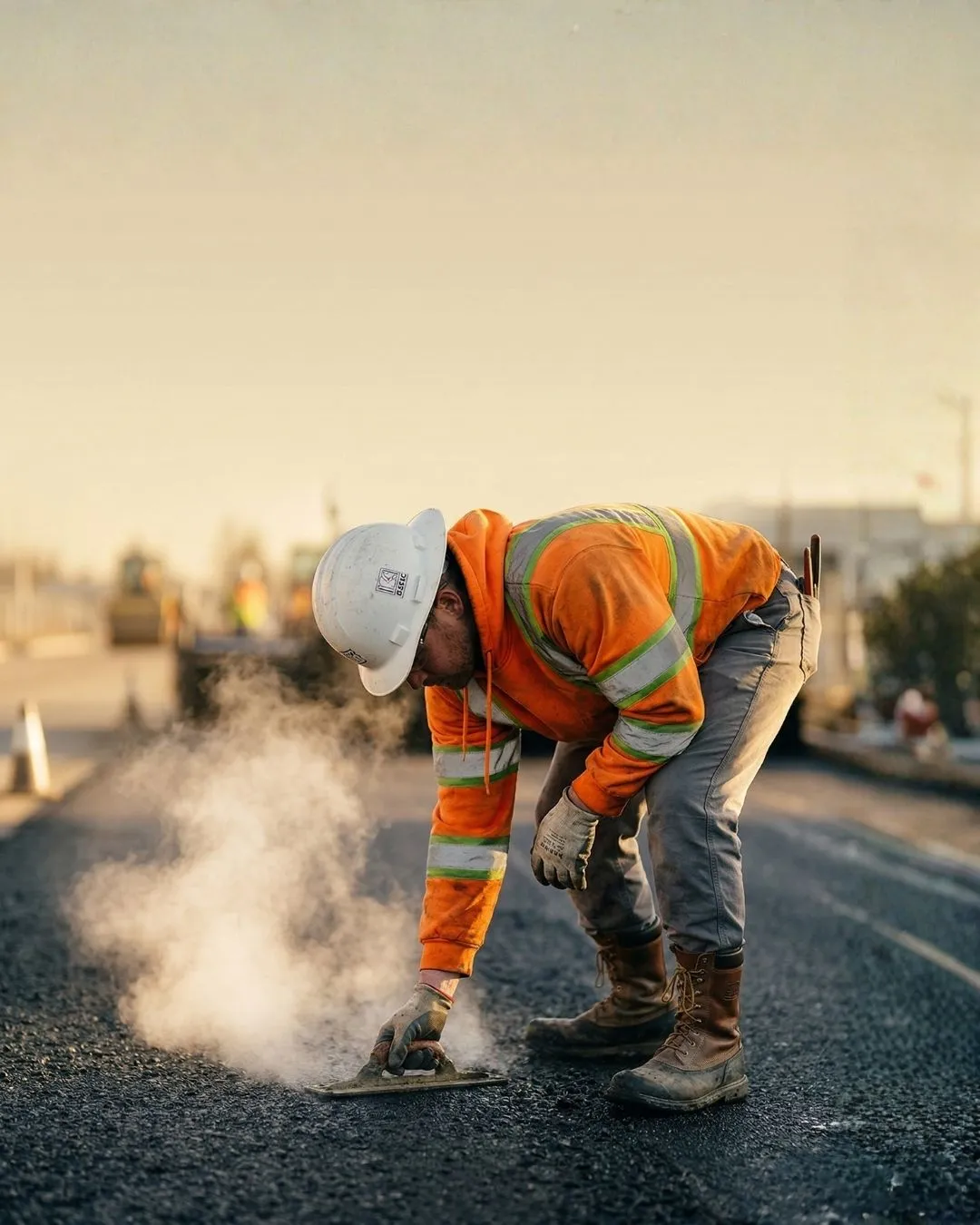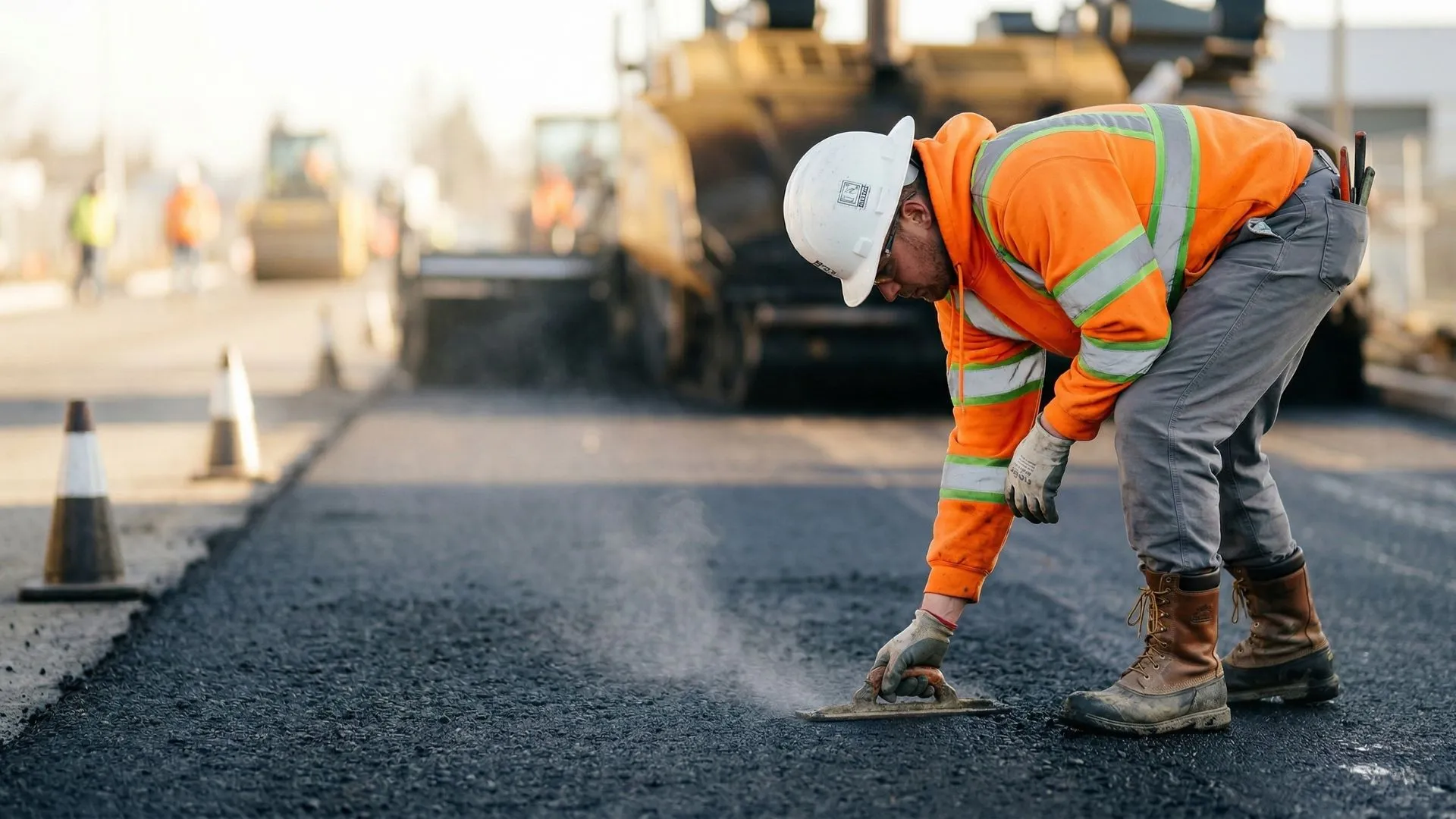 Operário realizando acabamento em pavimentação asfáltica com maquinário pesado ao fundo